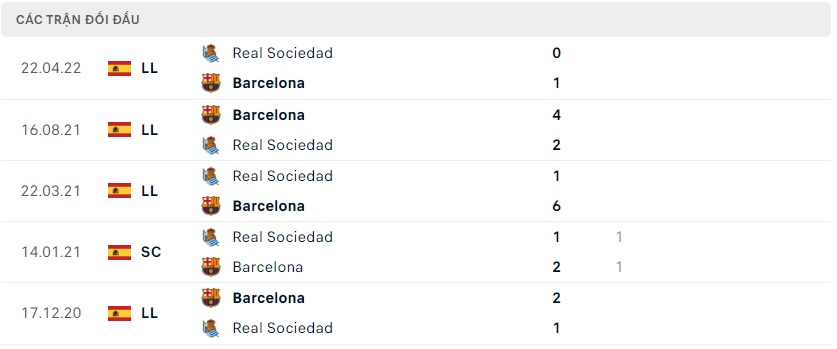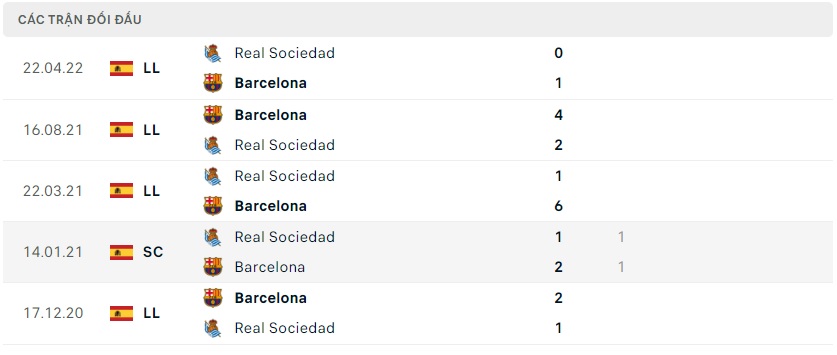 Thành tích đối đầu Real Sociedad vs Barcelona