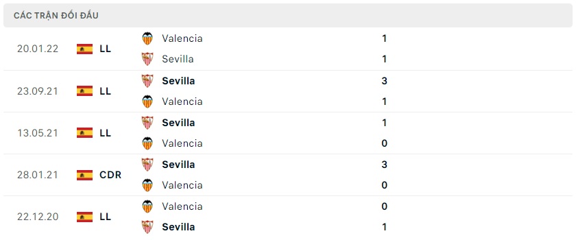 Thành tích đối đầu Sevilla vs Valencia