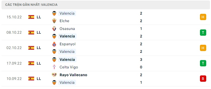 Phong độ gần đây Valencia