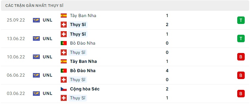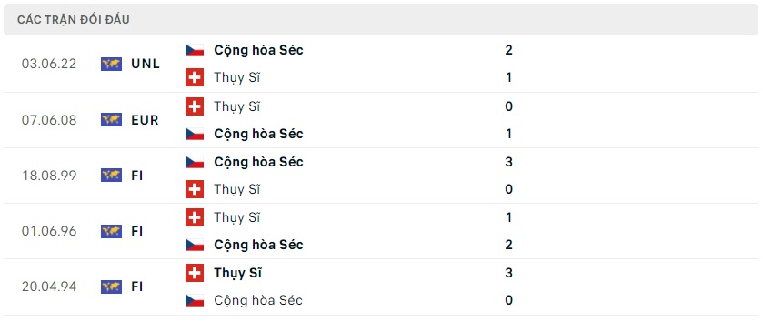 Thành tích đối đầu Thụy Sĩ vs Cộng hòa Séc