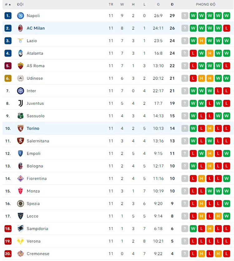 Đội bóng Torino vừa có được chiến thắng trên sân của Udinese ở vòng thi đấu vừa qua. Đây cũng là trận chiến thắng thứ 4 của họ ở mùa giải này. Sau tổng 11 vòng đấu, đội Torino có được 14 điểm và hiện đang xếp thứ 10 trên bảng xếp hạng.