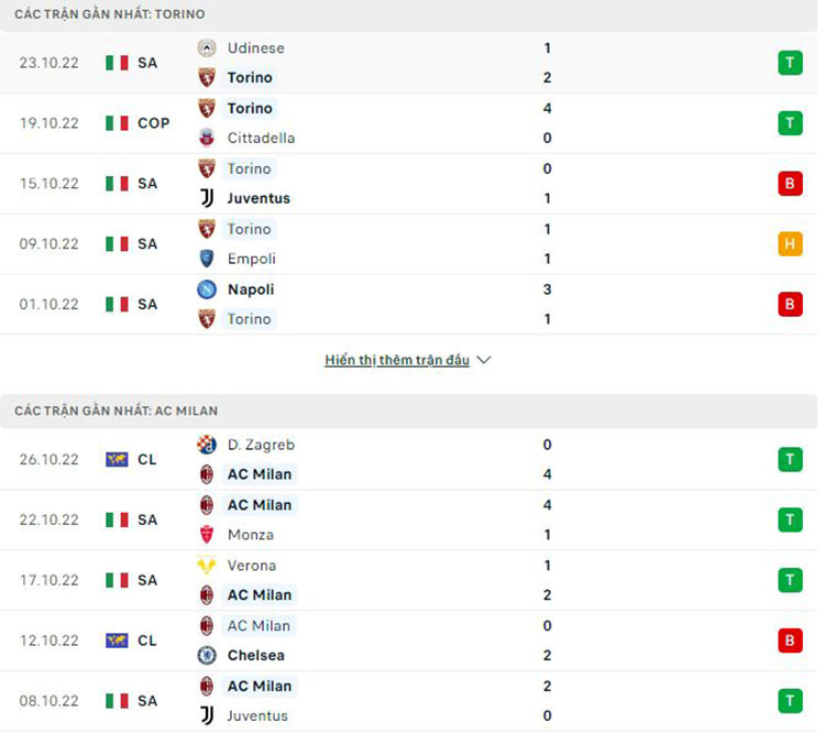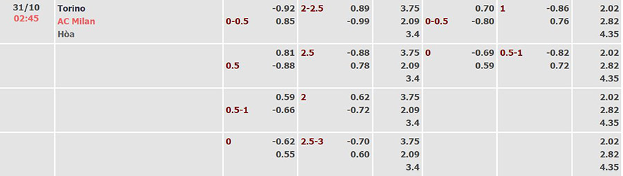 AC Milan cũng đã bất bại trên mọi đấu trường sân khách từ đầu giải, và thắng cả 2 kèo trận đối đầu ở mùa giải trước. Torino đã để thua kèo 3/4 trận đấu gần đây.