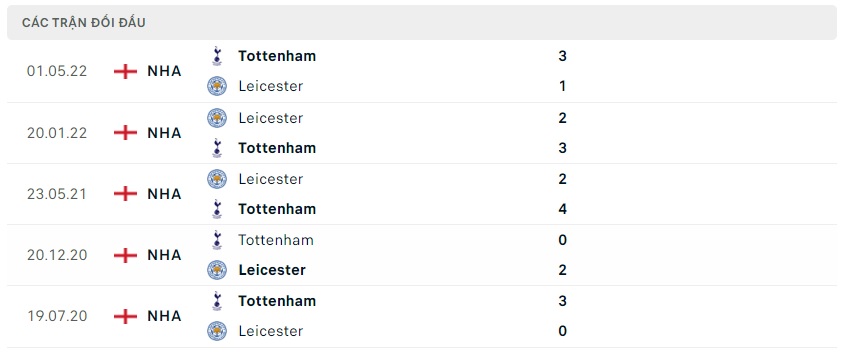 Thành tích đối đầu Tottenham vs Leicester