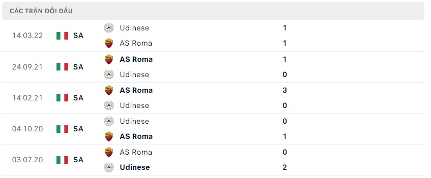 Thành tích đối đầu Udinese vs AS Roma