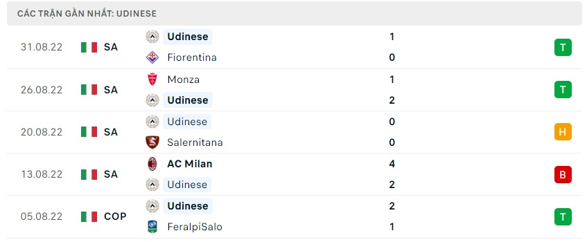 Phong độ gần đây Udinese