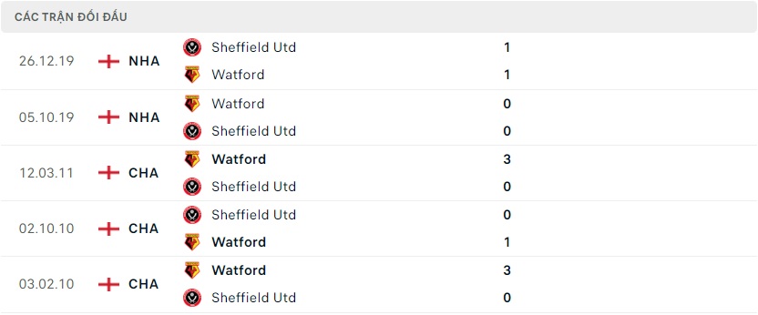 Thành tích đối đầu Watford vs Sheffield United