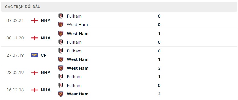 Thành tích đối đầu West Ham vs Fulham