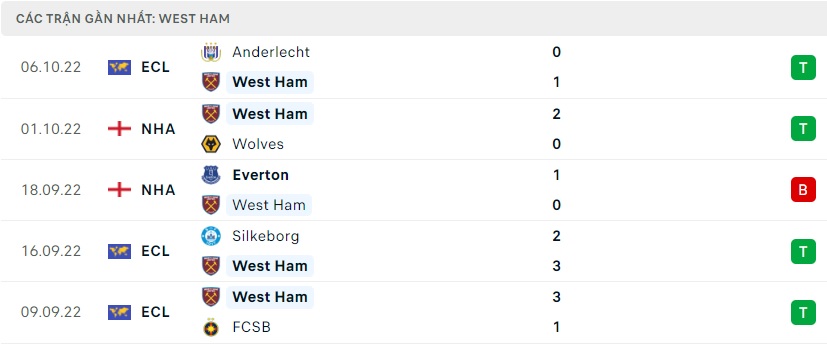 Phong độ gần đây West Ham