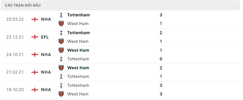 Thành tích đối đầu West Ham vs Tottenham
